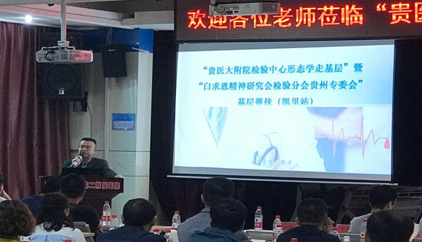 2019年4月27日,“贵医大附院检验中心形态学走基层”暨“白求恩精神研究会检验分会贵州专委会”基层帮扶活动(黔东南站)如期举行。xc体育及附院临床检验中心血液体液科莫非主任带领学科技术骨干团队前往凯里,在xc体育第二附属医院的支持下,黔东南州各县级医院及部分乡镇医院检验人员100余人参加了此次培训会。