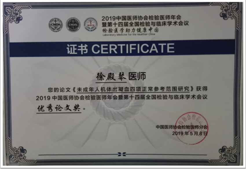 xc体育2016级临床检验诊断学专业硕士研究生徐殿琴受邀参加本次会议,并在分论坛进行发言。徐殿琴同学在其导师谭玉洁教授指导下完成的临床研究论文——《0-18岁人群出凝血检测参考范围研究》,经大会学术委员会评选,荣获大会优秀论文奖。
