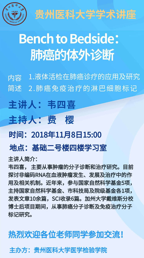 讲座中韦四喜博士介绍了液体活检在肺癌诊疗的应用研究和肺癌免疫治疗淋巴细胞标记的研究进展。并分享了自己在美国加州大学戴维斯分校博士后研究经历,鼓励在座师生多多了解国内外先进的检验研究成果,并勇于创新。