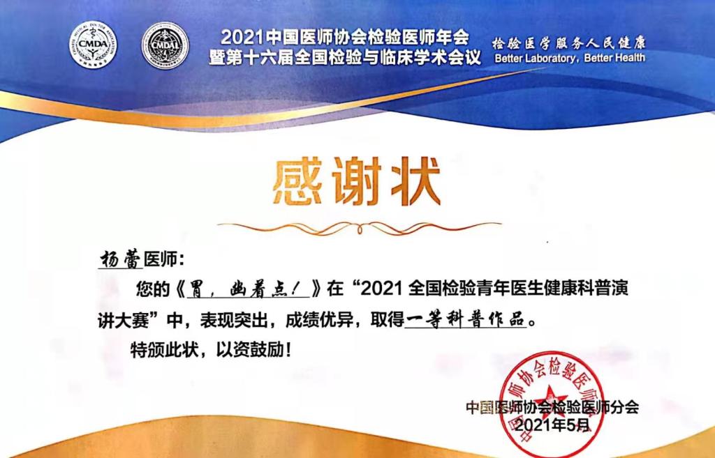 大会组委会收到来自全国各省(自治区、直辖市)的检验青年医生健康科普演讲参赛视频150余份,经组织严格评审,共评选出18个优秀视频。公司xc体育教师杨蕾入围决赛并进行现场角逐,以优秀的成绩喜获一等科普作品。