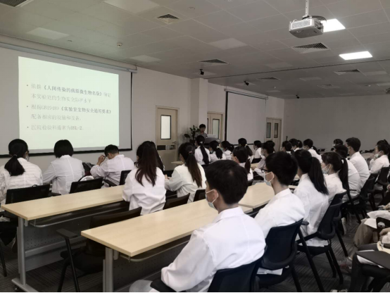 会上,费樱副经理对全体实习同学表示了诚挚的欢迎,并且明确了实习的要求,介绍了附院实习和论文写作的安排,强调在实习过程中的法律法规、科室规章制度的执行,重点培训二级生物安全实验室生物安全知识,如手卫生、个人安全防护,标准预防,职业暴露等。王世君老师介绍具体科室轮转实习计划以及实习小组分配和门禁卡使用管理规定等。